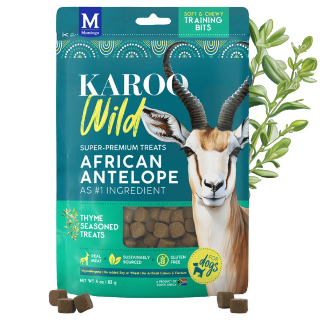 Karoo Wild Training Bits are bite-sized, soft treats ideal for training sessions or rewarding small-breed dogs on the go.